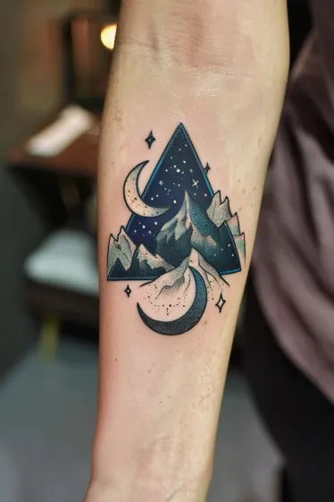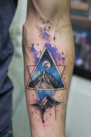 What I love about this tattoo is how it balances bold geometry with soft watercolor vibes. It feels strong but also full of wonder. The way the triangle frames the mountain and moon makes it feel almost like a portal to another world. It s the kind of piece that makes you stop and stare, especially if you re into tattoos that mix nature with a dreamy galaxy theme.