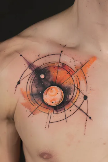 This bold chest tattoo features a glowing orange planet at the center, surrounded by fine geometric orbit lines and a deep-space watercolor background. The burnt orange tones blend beautifully with black and violet clouds, giving it that fiery cosmic vibe. Smaller planets float nearby, while thin lines and dots stretch out in all directions, mimicking a sleek galactic coordinate map. It s centered just right on the chest and feels super dynamic, like the universe itself is radiating outward from the heart.