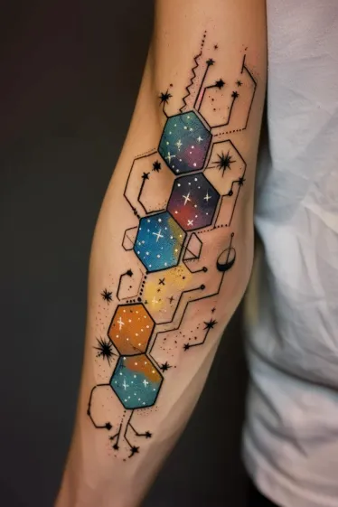 This ultra-cool forearm tattoo looks like a molecule straight out of a sci-fi dream. The structure is made of colorful hexagons, each one filled with a different pocket of the universe. Some glow with fiery orange and yellow, while others shimmer in blues and purples, all sprinkled with tiny stars and nebula textures. Black geometric lines connect everything with precision, and there are fun little planetary and circuit-like elements branching off to make it feel both cosmic and techy.