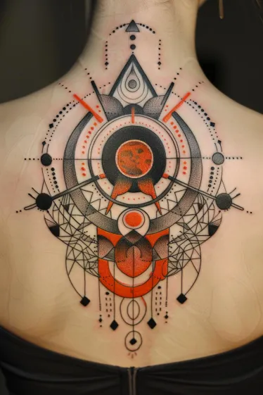 This tattoo is a total showstopper. It s a bold full-back design made up of intricate geometric shapes, stunning dotwork, and a fiery red and black color palette that gives serious cosmic energy. The circular patterns look like planetary orbits, all perfectly aligned with what seems to be a glowing red planet in the center. There s symmetry, balance, and a ton of movement going on, with lines and shapes that stretch across the back like a high-fashion star map.