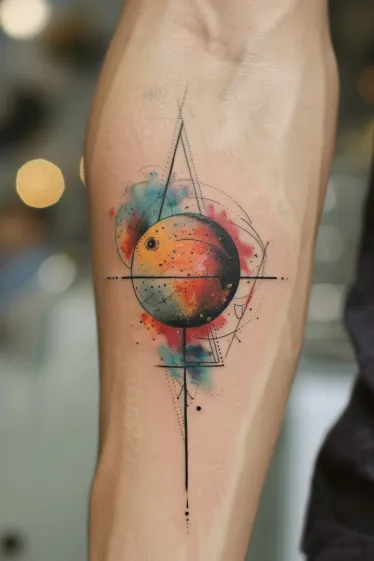 This forearm tattoo captures a bold, circular planet at the center, framed by clean geometric lines that give it a sharp and modern edge. The real showstopper is the watercolor background. Splashes of red, orange, blue, and even a little bit of black swirl together like a cosmic nebula, creating that dreamy, painterly vibe. It feels like space meets fine art, and I love how the tattoo plays with contrast between soft and sharp elements.