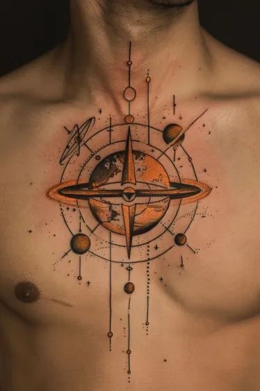 Orange Planet Orbit Chest Tattoo