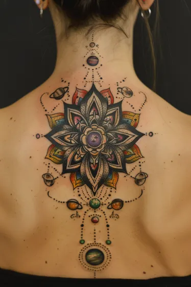 This enchanting full-back tattoo combines a detailed mandala flower with a flowing line of planets, creating a perfect balance between sacred geometry and galactic wonder. The mandala is rich in color and depth, layered with sharp petals, textured shading, and a radiant galaxy center. From top to bottom, planets orbit around the design in a dotted path, each one vibrant and unique in tone. It s beautifully symmetrical and flows naturally with the curve of the spine, giving it a powerful yet graceful presence.