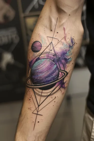 This eye-catching forearm tattoo features a stunning purple planet surrounded by sharp black rings and layered with clean geometric shapes. There s a smaller pink moon nearby, and the background explodes with soft clouds of watercolor in dreamy purples, teals, and hints of stardust white. Dotted stars and delicate linework scatter throughout the space around the planets, adding a cosmic sparkle that ties the whole piece together. It s vibrant, balanced, and totally out of this world.
