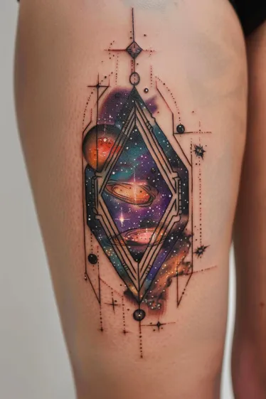 This thigh tattoo feels like a peek through a cosmic portal. The diamond-shaped frame is bold and futuristic, almost like a sci-fi keyhole opening up into the galaxy. Inside, swirling galaxies and planets stretch across a dreamy night sky painted in vibrant purples, oranges, and deep blues. The whole piece is surrounded by tiny dotted stars and delicate geometric accents that make it feel like the universe is expanding around the design.