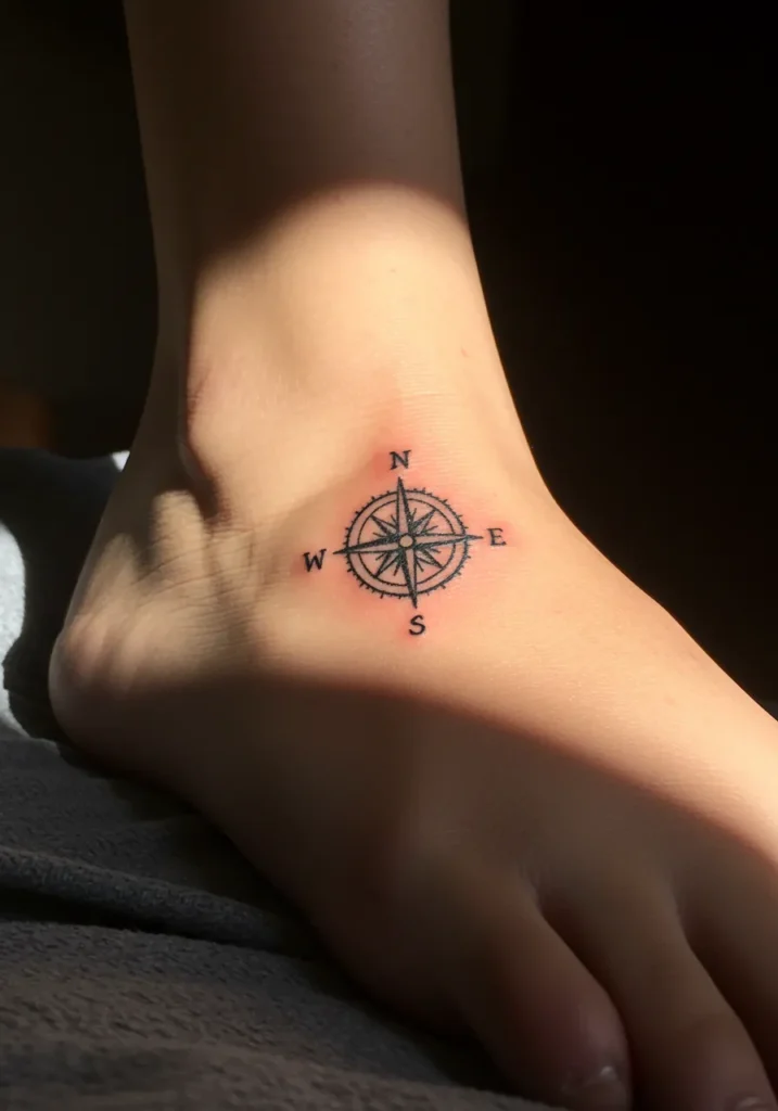 This delicate compass tattoo, placed near the ankle, shows off fine black lines and minimal shading for a clean, balanced finish. Each directional point N, S, E, and W is perfectly centered, giving it that sense of quiet precision and purpose. Its small size makes it ideal for a subtle, stylish piece.