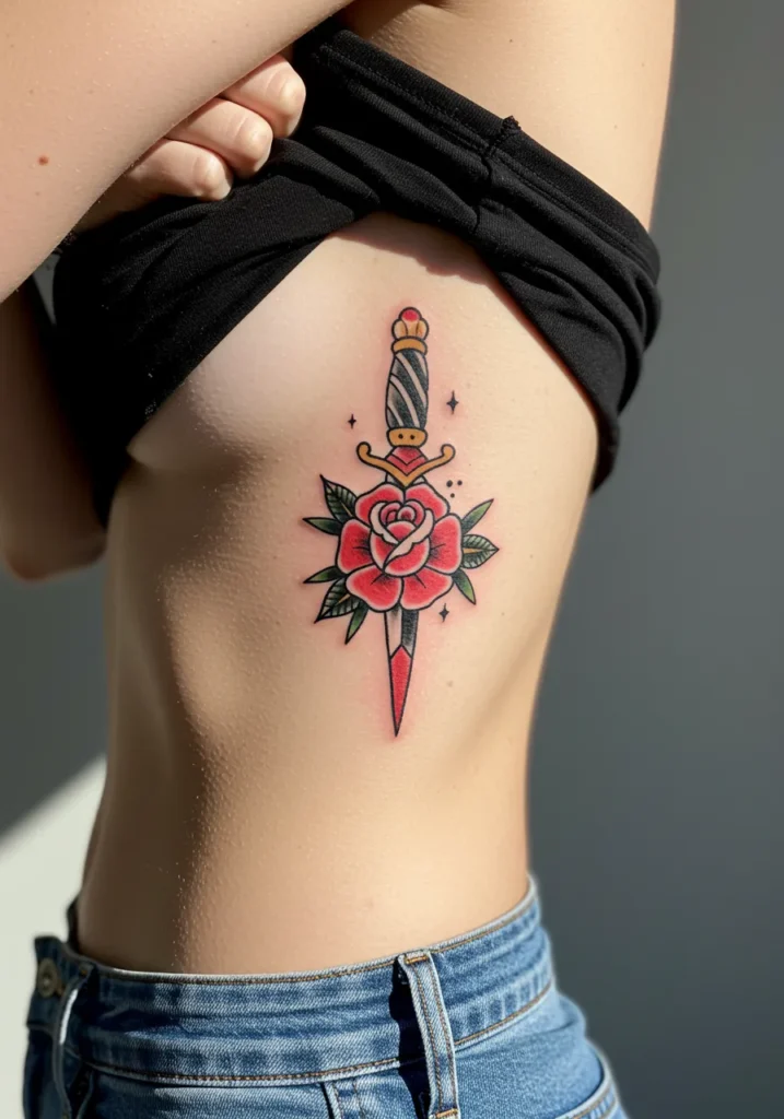 This tattoo on the side of the ribcage shows a red rose pierced by a detailed dagger, blending elegance and strength perfectly. The colors are rich deep red petals, green leaves, and gold accents on the handle all outlined with bold black lines that define the traditional American look.