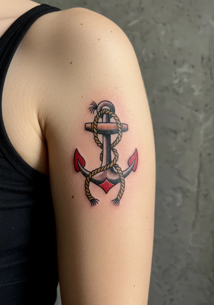 This American traditional anchor tattoo sits proudly on the upper arm, its metallic gray base wrapped neatly with golden rope and accented by pops of red at the anchor s tips. The lines are bold, the shading crisp, and the placement perfect for a small but classic look.