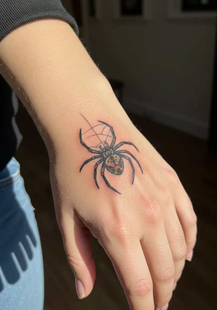 This tattoo on the back of the hand shows a black widow spider in traditional American flash style, complete with clean black outlines and small pops of red on its legs and hourglass marking. The fine web line above adds a delicate touch that contrasts perfectly with the spider s bold presence. The placement makes it hard to miss, but the size keeps it classy and sleek.