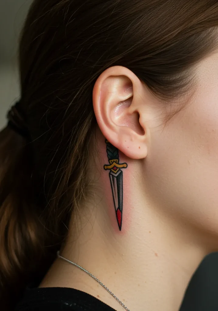 This sleek mini dagger tattoo sits just behind the ear, with bold outlines and pops of red, yellow, and blue giving it that unmistakable American traditional vibe. Its placement makes it edgy and unexpected while still staying small and elegant. The design feels crisp and deliberate, almost like a secret piece of armor tucked just out of sight.