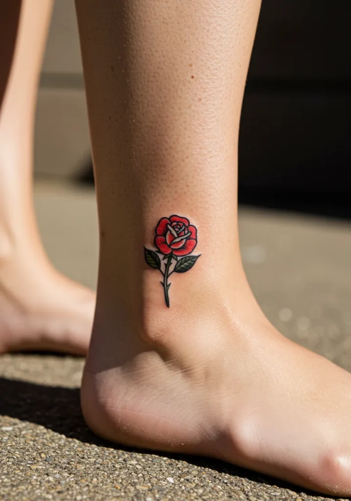This small American traditional rose tattoo sits beautifully near the ankle, its vivid red petals outlined in bold black with a deep green stem and leaves. The placement gives it a graceful yet understated feel, perfect for someone who wants a touch of old-school charm without going overboard. The crisp lines and tiny size make it look effortlessly classic, catching light just enough to show off the detail.