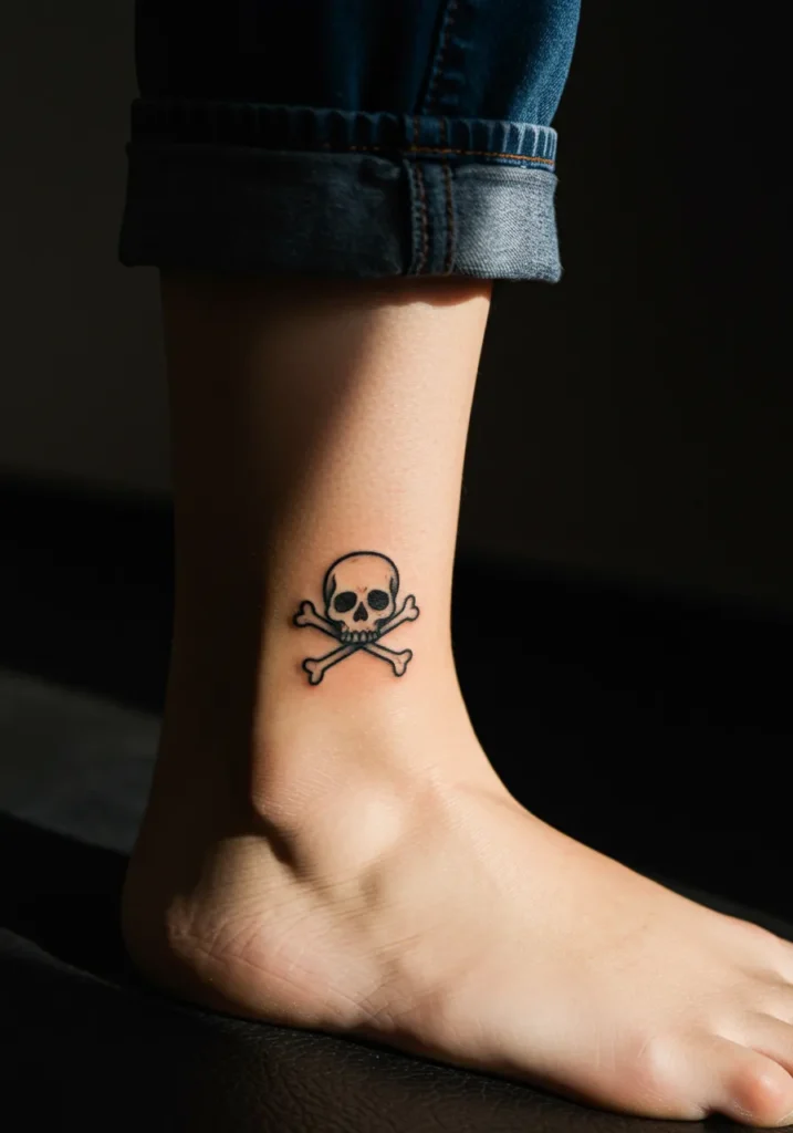This small ankle tattoo features a simple yet bold skull and crossbones, perfectly outlined in black with subtle shading that gives it depth without overcomplicating the design. The placement near the ankle bone makes it a playful but edgy piece, standing out beautifully against the skin. It s the kind of tattoo that looks effortlessly cool with rolled-up jeans or bare feet in summer.