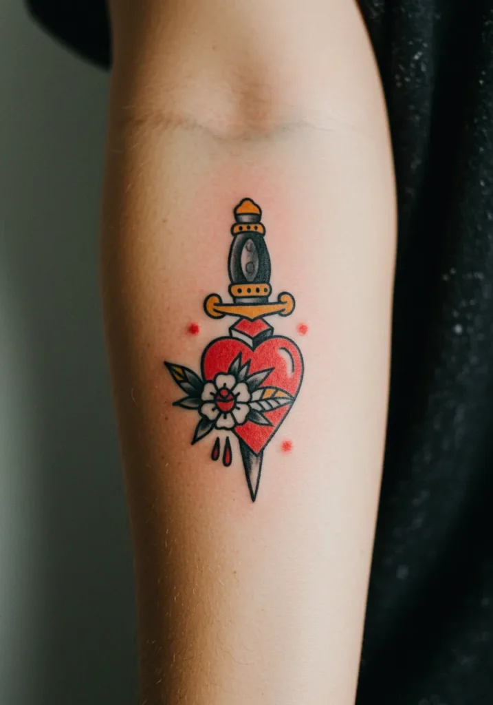This small tattoo features a red heart pierced by a dagger, framed with a white flower and delicate leaves, placed perfectly on the inner arm. The bold lines, rich red tones, and little drops of blood give it that unmistakable old-school flair. It s compact but full of symbolism love, courage, and the bittersweet balance between them.