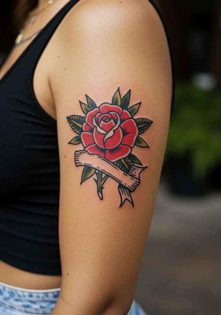 This small American traditional tattoo on the upper arm features a bold red rose surrounded by green leaves and framed by a blank banner. The strong black outlines and saturated colors make the design pop beautifully against the skin. The size is just right noticeable without being overpowering and the placement on the outer arm gives it a timeless, confident feel.