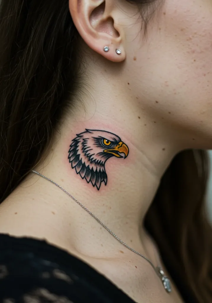 This tiny eagle tattoo sits just below the ear, showing off sharp lines, black shading, and a golden beak that glows against the skin. It s small but powerful, drawn in that bold, traditional American flash style that symbolizes strength and freedom. The clean placement on the side of the neck adds a confident edge.