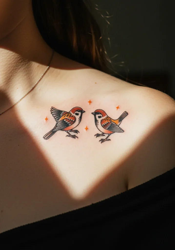 This sweet chest tattoo features two small sparrows facing each other, done in warm tones of orange, brown, and black. The birds are perfectly symmetrical, surrounded by tiny orange star accents that add a little sparkle. The placement just below the collarbone gives it a soft, romantic look.