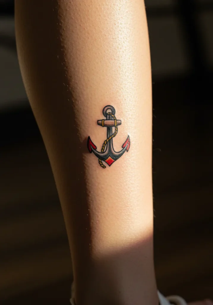 This small anchor tattoo, placed on the back of the leg, brings nautical nostalgia in a neat, polished package. The clean black outline, tiny rope detail, and subtle red accents give it that iconic sailor-inspired American traditional look. Its small size makes it wearable anywhere while still keeping its vintage charm.