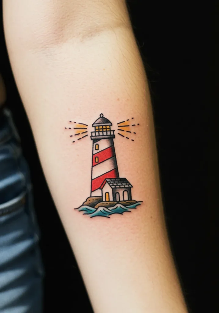 This charming lighthouse tattoo is inked on the forearm, featuring a red-and-white striped tower shining light in golden hues. Waves crash softly at the base, adding a splash of blue and motion to the design. The crisp outlines and cheerful colors make it pop against the skin while staying true to that vintage American traditional feel.