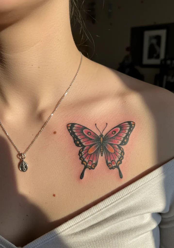 This elegant butterfly tattoo rests gracefully on the upper chest, just below the collarbone. Its wings blend shades of pink, orange, and black, outlined boldly in the timeless American traditional style. The symmetry and detailing make it eye-catching without feeling overwhelming, and the placement adds a delicate, feminine charm.