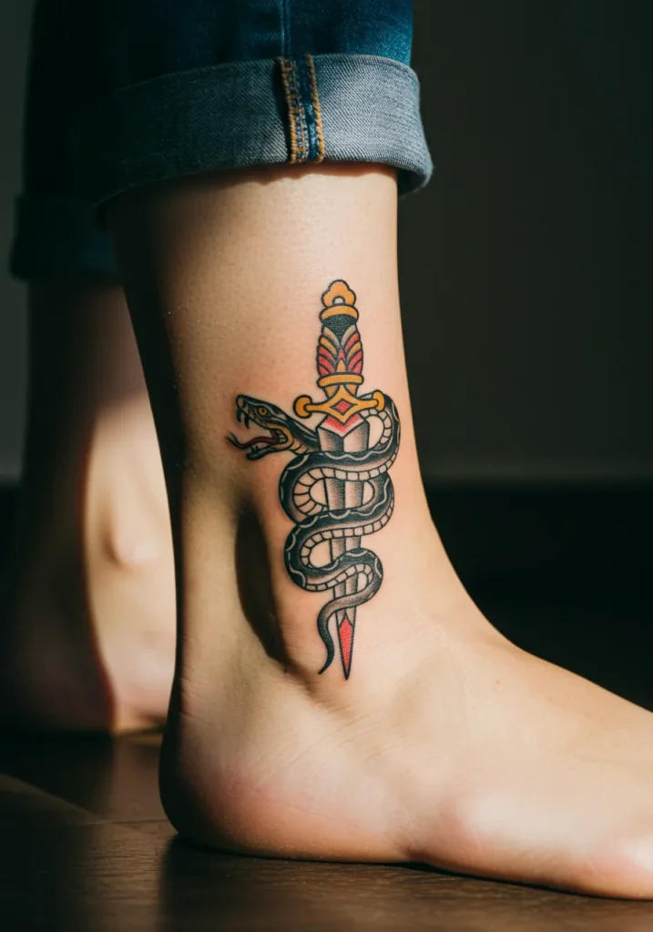 This bold ankle tattoo features a dagger wrapped in a coiled snake, with sharp lines and saturated reds, yellows, and blacks that capture that unmistakable traditional look. The clean composition and vivid colors make it a statement piece even in its small size.