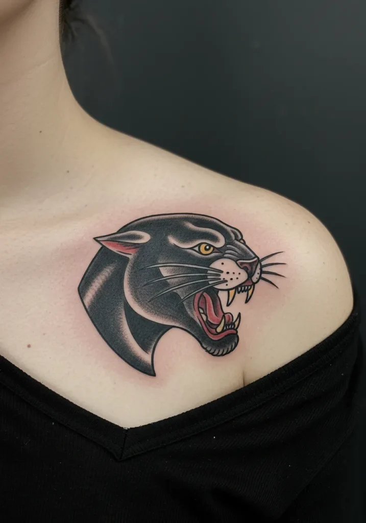 This classic black panther tattoo sits strikingly on the shoulder, small enough to stay subtle but bold enough to make a statement. The sharp lines, yellow eyes, and open mouth capture that fierce old-school energy perfectly. The clean shading and bold black ink bring the whole piece to life without feeling overwhelming.
