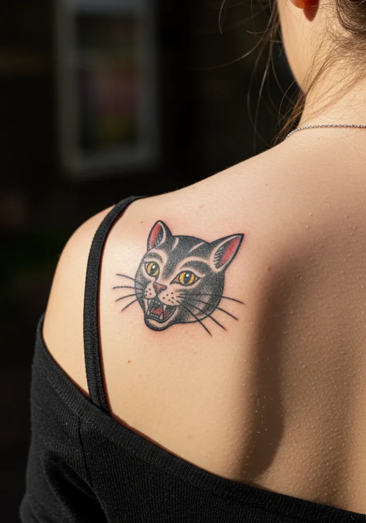 This tattoo on the back of the shoulder shows a classic black cat face done in true American traditional style. It s small, clean, and perfectly outlined, with expressive yellow eyes and a touch of pink inside the ears. The bold contrast of black shading and simple linework makes it feel vintage yet full of life.