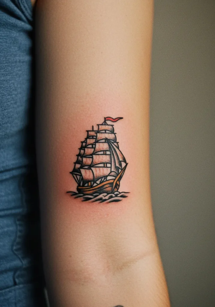 This elegant little tattoo shows a tall ship sailing through small waves, placed neatly on the back of the upper arm. The artist kept the palette minimal with shades of black, soft gray, and muted gold, making it look effortlessly vintage. The bold outlines and small size make it ideal for anyone who loves classic flash art.