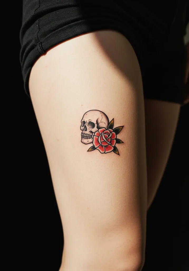 This small tattoo sits beautifully on the upper thigh, combining a finely detailed skull with a bold red rose blooming beside it. The black outlines and muted shading give it that classic American traditional edge, while the bright red petals and green leaves add a striking pop of color. It s compact, balanced, and effortlessly cool.