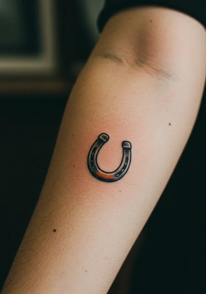 This small American traditional horseshoe tattoo, inked on the arm, features deep shading and a soft orange glow for a vintage effect. Its tidy placement and bold outline make it feel classic and balanced, almost like a good luck charm you never take off.