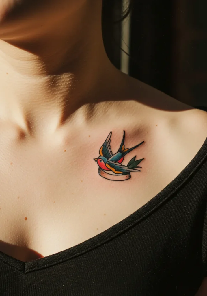 This small American traditional tattoo rests beautifully near the collarbone, featuring a swallow in flight with rich blue, red, and yellow tones outlined in solid black. The shading and clean lines make it pop, while the placement adds a soft, feminine touch that moves naturally with the body.