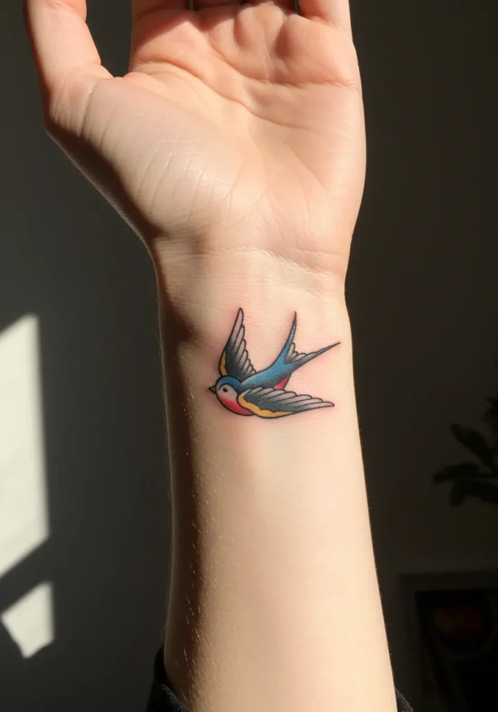 This tiny swallow tattoo on the inner wrist is a perfect example of subtle beauty. The little bird, drawn in traditional colors of blue, red, and gold, looks graceful mid-flight. The crisp outlines and clean shading make it stand out while still feeling light and minimal.