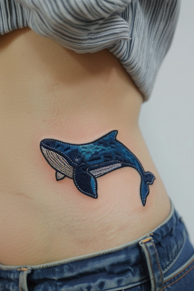 This tattoo showcases a beautiful blue whale rendered in a patchwork embroidery style that looks as though it s been stitched straight onto the skin. The deep navy and teal tones create a stunning oceanic gradient, while the detailed stitching along the whale s belly adds a realistic texture. The gentle curve of the design captures the grace and majesty of this giant of the seas, making it feel both serene and powerful.