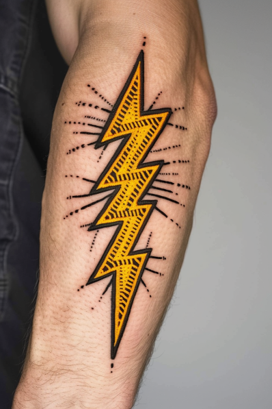 This tattoo features a bold, jagged lightning bolt in a striking patchwork embroidery style. The vivid yellow design is outlined with thick black stitching, creating sharp, clean edges that make it pop against the skin. Radiating lines and dotted accents surrounding the bolt add a dynamic, high-energy effect, almost like it s buzzing with electricity. The embroidery-inspired texture gives it a tactile, handcrafted vibe while still maintaining its powerful simplicity.