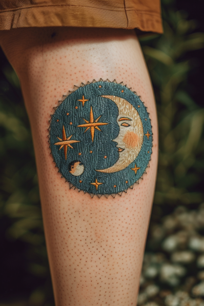 This tattoo features a dreamy crescent moon surrounded by twinkling stars in an enchanting patchwork embroidery style. The deep navy background contrasts beautifully with the golden stars and the moon s soft, blush-toned cheeks, creating a magical night-sky effect. The stitching detail is remarkable, giving it a textured, hand-sewn appearance, while the circular border adds a neat, finished look, almost like a cosmic badge of honor.