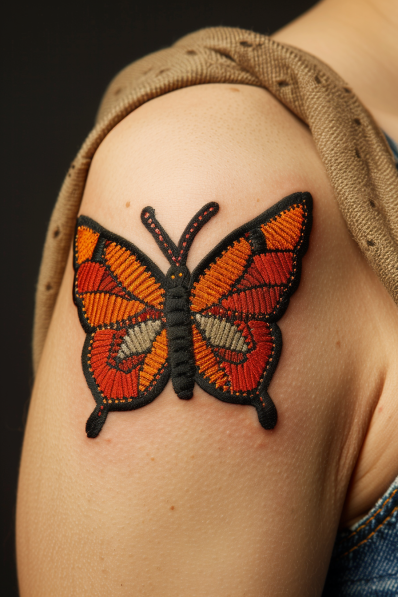 This tattoo brings a bold butterfly to life in an intricate patchwork embroidery style. The wings feature a stunning mix of fiery orange, deep red, and subtle gold hues, all outlined in thick black stitching for a striking contrast. The textured details make it look as though this butterfly was delicately sewn onto the skin, with perfectly symmetrical patterns that feel both dynamic and balanced.
