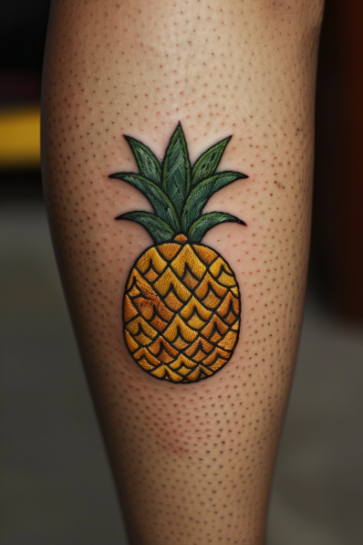 I absolutely love the playful and welcoming vibe of this tattoo! Pineapples are often seen as symbols of hospitality, warmth, and good vibes, and this design captures that perfectly with its bold colors and charming detail. The embroidery effect gives it a quirky, handcrafted feel that makes it stand out. If you re someone who loves tropical aesthetics or just wants a fun, feel-good design, this pineapple tattoo is a juicy pick pun intended!