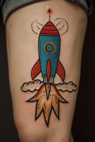 This tattoo takes off with a vibrant retro-style rocket in bold embroidery fashion. The teal and red body is stitched with intricate detail, complete with a glowing orange flame trail bursting out of fluffy, cartoonish clouds. The playful stitching adds texture, making it look like this rocket is ready to blast off straight from a fabric patch. The small touches, like the dotted thread loops suggesting motion, give the whole design an energetic vibe.