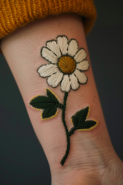 I love how simple yet meaningful this design is! Daisies often symbolize innocence, new beginnings, and joy, and the embroidery effect makes it feel playful and unique. It s perfect for anyone who loves nature-inspired tattoos or wants something bright and uplifting. This piece feels like carrying a little slice of springtime everywhere you go sweet, subtle, and full of charm!