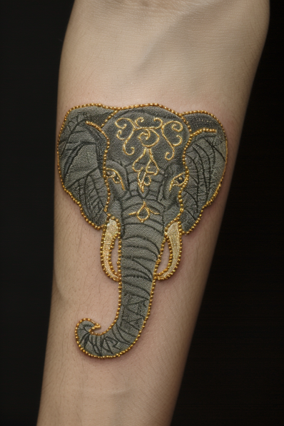 This tattoo features a regal elephant head in a striking patchwork embroidery style. The design uses muted gray tones for the elephant s textured skin, accented with intricate golden threadwork that adds a touch of elegance and sophistication. The fine details, such as the ornate patterns on the forehead and the subtle stitching along the ears and trunk, give the piece a stunning handcrafted look. The golden outline further enhances the patch-like effect, making it stand out beautifully.