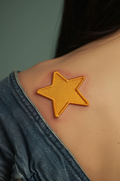 This tattoo features a bold, golden star in a patchwork embroidery style that looks like it was carefully stitched onto the skin. The vibrant yellow tones and the clean, symmetrical design give it a cheerful, playful feel. The stitching detail is incredibly precise, creating the perfect illusion of a fabric star sewn into place a simple yet striking design that feels timeless.