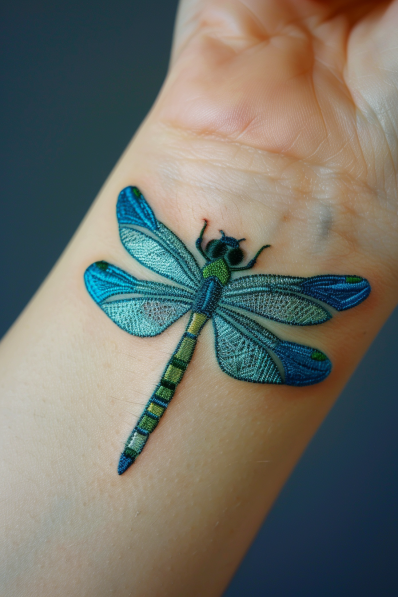 This tattoo features an intricate dragonfly in a stunning patchwork embroidery style. The vibrant wings shimmer in shades of blue and teal, with a detailed thread-like texture that gives the design depth and realism. The dragonfly s body is accented with earthy greens and yellows, creating a beautiful contrast against the cool tones of the wings. Its lifelike symmetry and delicate stitching make it feel as though it could take flight at any moment.