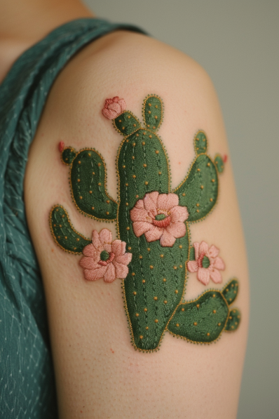 This tattoo features a lively cactus adorned with delicate pink flowers, all brought to life in an intricate embroidery patch style. The lush green cactus is dotted with golden thread-like details, adding texture and depth, while the soft blush-pink blossoms provide a beautiful contrast. The stitching effect around the edges makes the design pop, giving it the perfect sewn-on appearance that s playful yet refined.