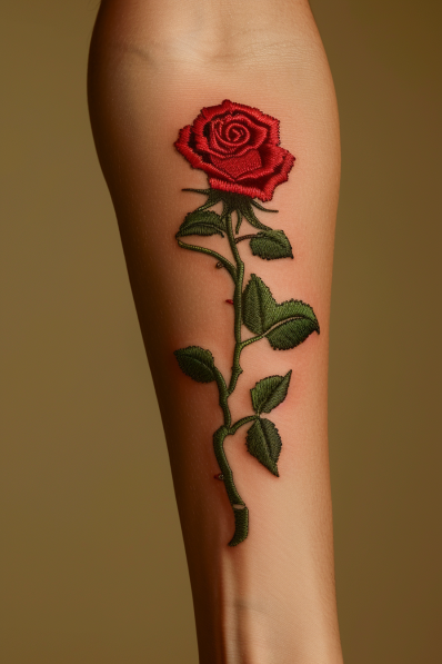This tattoo features a stunning red rose atop a long, delicate stem, all rendered in a detailed embroidery patch style. The rich crimson petals are meticulously stitched to capture the rose s elegance, while the vibrant green leaves and stem add a natural balance. The embroidery effect gives the design a textured, lifelike quality that feels like it was lovingly crafted with needle and thread.