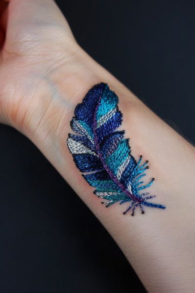 This tattoo showcases a beautifully detailed feather in a stunning patchwork embroidery style. The design blends shades of deep blue, teal, and subtle purple, creating a dynamic and eye-catching gradient. The intricate stitching along the feather s barbs adds a textured, lifelike quality that makes it appear as if it s sewn directly onto the skin. The soft, flowing lines give it a delicate yet bold presence.