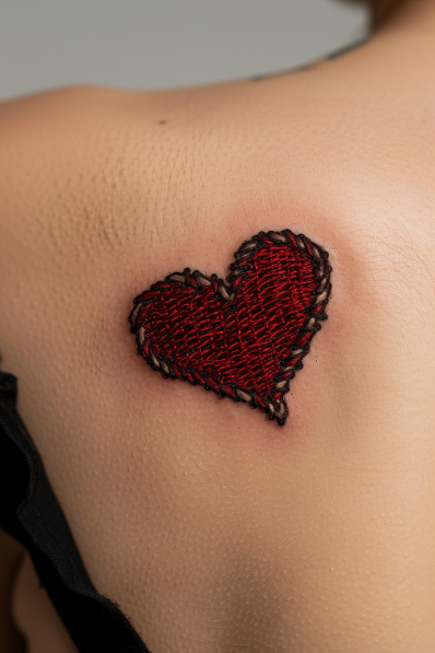 This tattoo showcases a rugged, stitched heart in a deep crimson red, surrounded by bold black thread that mimics a hand-sewn patch. The uneven, textured stitching gives it a raw, slightly edgy vibe, as if the heart has been lovingly patched back together. The details in the embroidery-style threadwork make it feel tactile and three-dimensional, adding an authentic worn-in charm to the design.