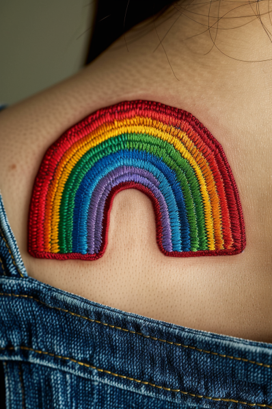 This tattoo beautifully captures a vibrant rainbow in an embroidery-inspired patchwork style. Each color from the deep red border to the rich purple arc is vividly stitched, creating a texture that looks like it was pulled straight from a sewing kit. The arch is clean and symmetrical, with thread-like details that give it a realistic, handcrafted appearance. The design radiates positivity and joy, with colors that pop against the skin.
