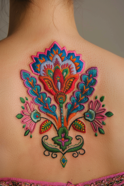 This tattoo is a stunning showcase of traditional floral embroidery brought to life on the skin. Bursting with vivid colors like hot pink, electric blue, bright orange, and emerald green, the design mimics the intricate needlework of folk art. The symmetrical arrangement of flowers, leaves, and ornamental details creates a bold centerpiece that feels both vintage and modern. The fine stitching effect adds texture, making it appear as though it s been sewn directly onto the skin.