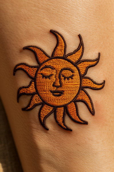 This design showcases a radiant sun with a serene, closed-eye expression, executed in a patchwork embroidery style that mimics actual threadwork. The warm orange and gold tones create a glowing effect, while the intricate black stitching adds definition to the smiling face and wavy rays. The texture is so spot-on that it looks like it was plucked straight from a cozy quilt, blending celestial charm with artistic flair.