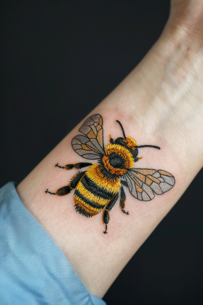 This tattoo features a charming bumblebee designed in a patchwork embroidery style that looks as if it s been stitched right onto the skin. The bold black and golden-yellow stripes create a striking contrast, while the delicate wing details in soft gray tones add a touch of lightness and realism. The textured stitching across the bee s fuzzy body gives it a lifelike, almost tactile quality that s utterly delightful.