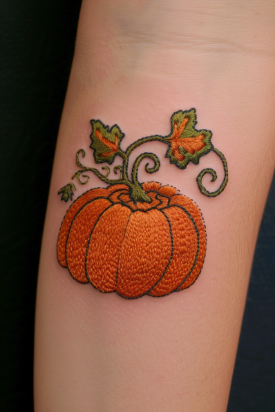 This tattoo captures the essence of autumn with a charming pumpkin designed in a detailed patchwork embroidery style. The bright orange pumpkin features realistic stitching lines that mimic the texture of fabric, while the curling green vines and delicately embroidered leaves add an extra layer of whimsy. The subtle shading and bold outlines make the entire piece pop, giving it a cozy, handcrafted vibe.